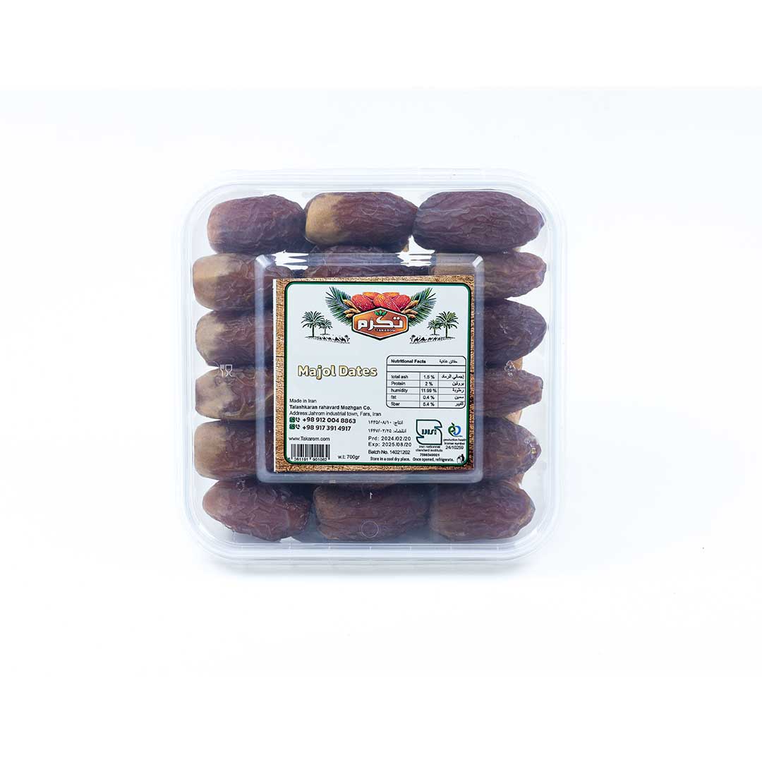 Known as the “King of Dates,” Medjool dates are a native Iranian variety now made available worldwide by Takarom Company. These dates are larger and more elongated than other types, typically low in moisture, and come in both dry and semi-dry forms. Medjool dates have a caramel-like taste with a soft, sweet texture. We recommend buying Medjool dates not only for their flavor but also for their numerous health benefits. Their high fiber content aids in weight loss, and the potassium helps maintain heart health. Additionally, the magnesium, manganese, copper, and calcium present in Medjool dates support dental and bone health!