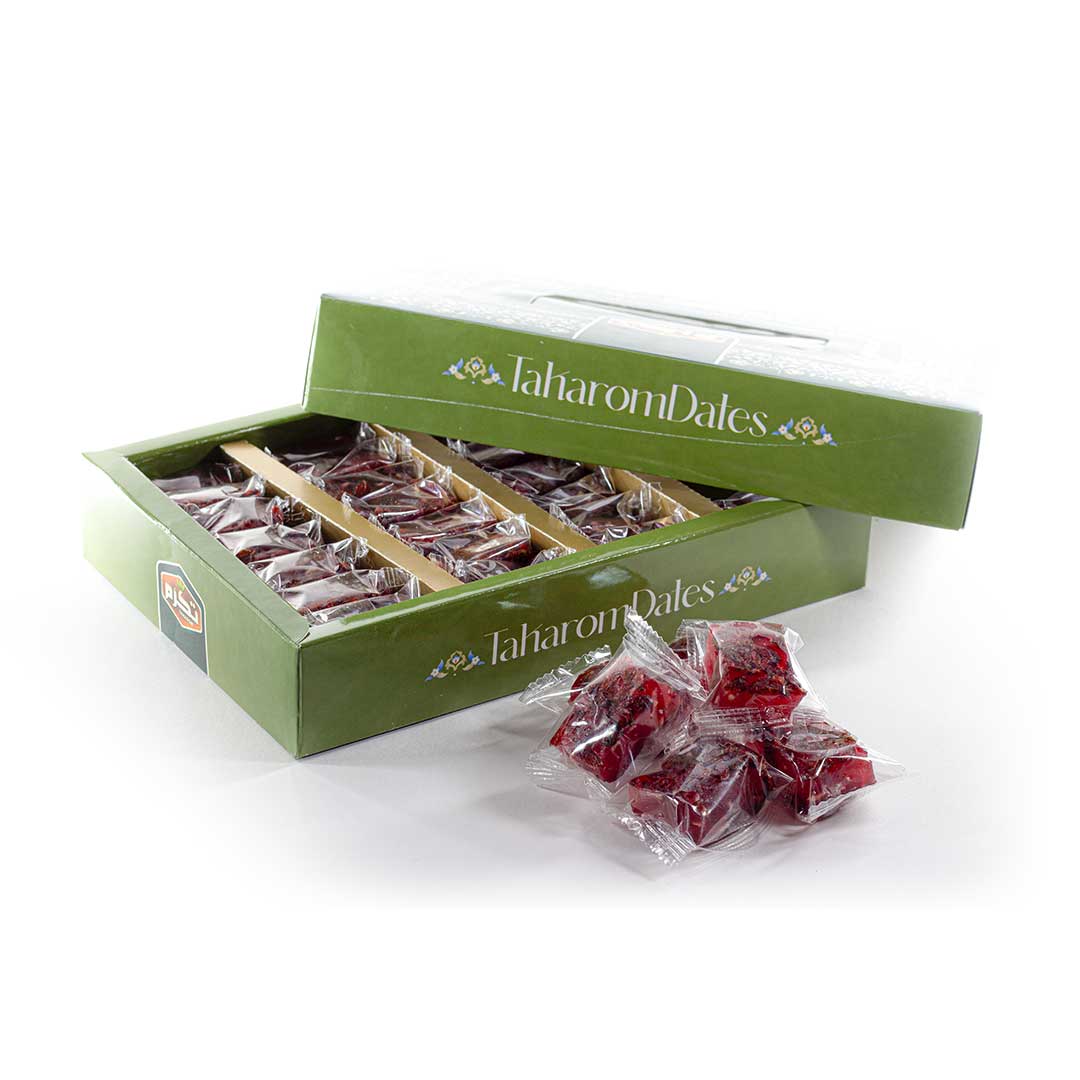 Nutty masghati with barberry coating is a type of masghati, a traditional Iranian dessert. In Iran, to make masghati, starch is first dissolved in water and then heated; after reaching the desired consistency, sugar and saffron are added, and the mixture is decorated with nuts. Masghati has a sweet taste, a soft texture, and an elastic state! The presence of nuts, saffron, and rose water all increase the properties of masghati! We at Takarom Food Industry Company are trying to recreate this delicious and popular Iranian dessert in a modern style and bring it to you in every corner of the world!